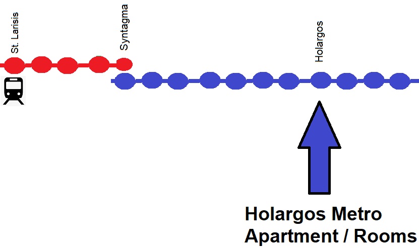 Its very straighforward to travel between Larisis Railway Station and my Apartment. Larisis Railway Stationis next to St. Larisis metro station (red line) and my Apartment next to Holargos metro station (blue line). You just have to change line at Syntagma metro station.